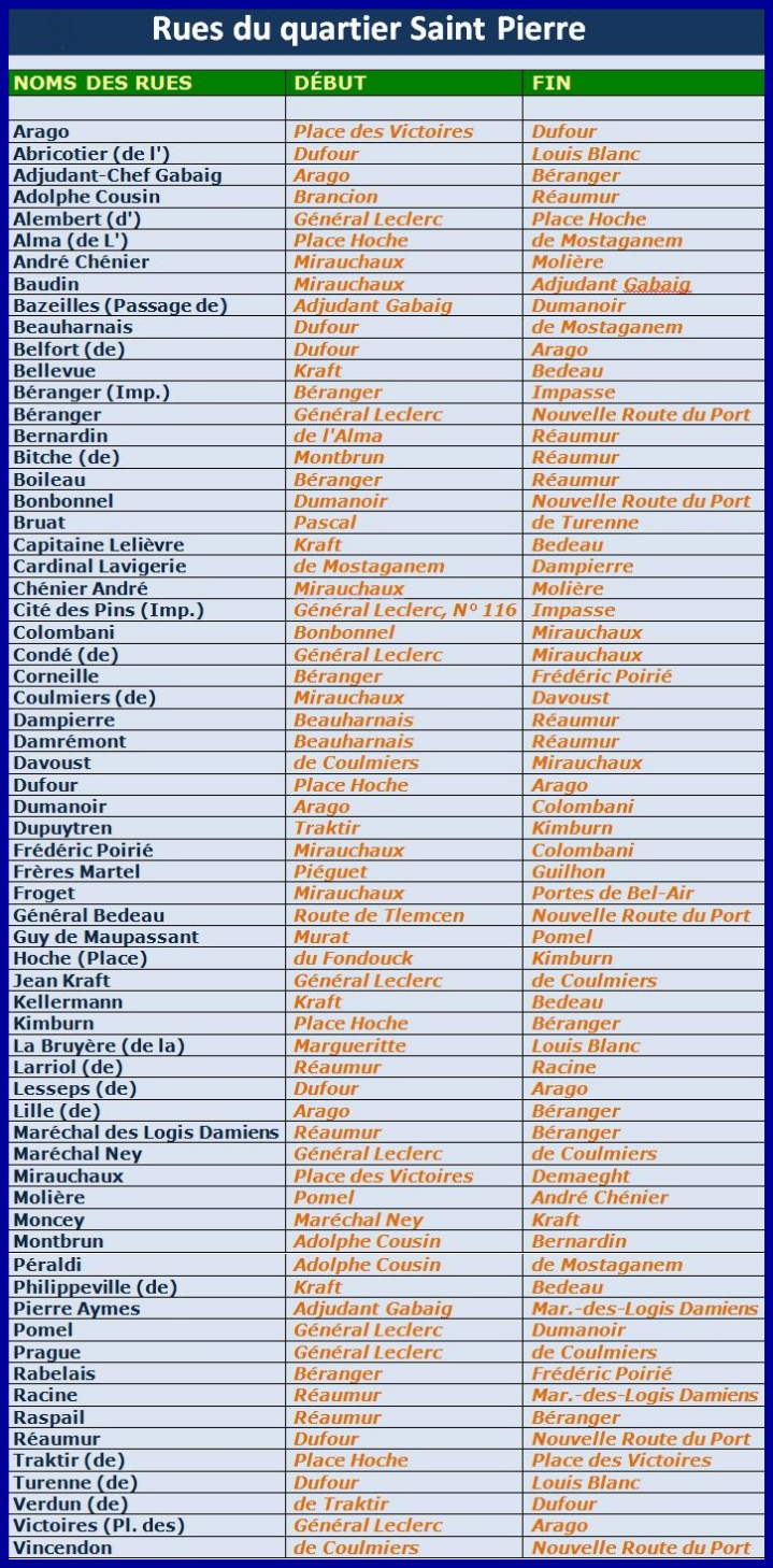 Tableau de toutes les rues qui composaient le quartier Saint Pierre.